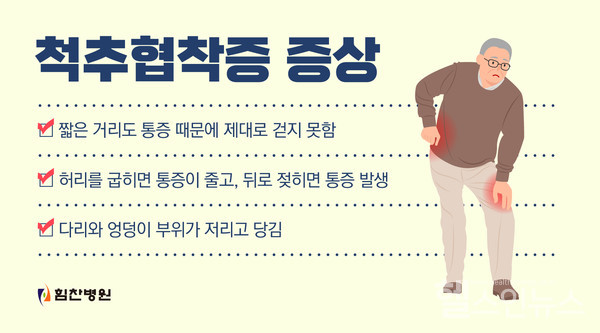 허리협착증 초기에는 요통이 나타나며 일반적으로 허리를 펼 때 통증이 심하고 구부릴 때 좁아진 척추관이 넓어지면서 통증이 호전되는 양상을 보입니다. 앉아 있으면 통증이 적어지고 조금 걸으면 다리가 아파서 쉬거나 걷기를 반복하게 되며 심해질수록 걸을 수 있는 거리가 짧아져 내 발 같지 않은 감각 이상을 보입니다. 허리를 구부릴 때 통증이 적기 때문에 자연스럽게 허리를 굽힌 상태를 지속적으로 유지하게 되면서 꼬불꼬불 허리를 만들게 되어 일명 ‘꼬불 할머니병’이라고 불리기도 합니다.