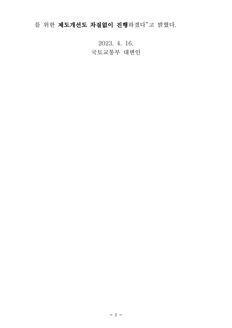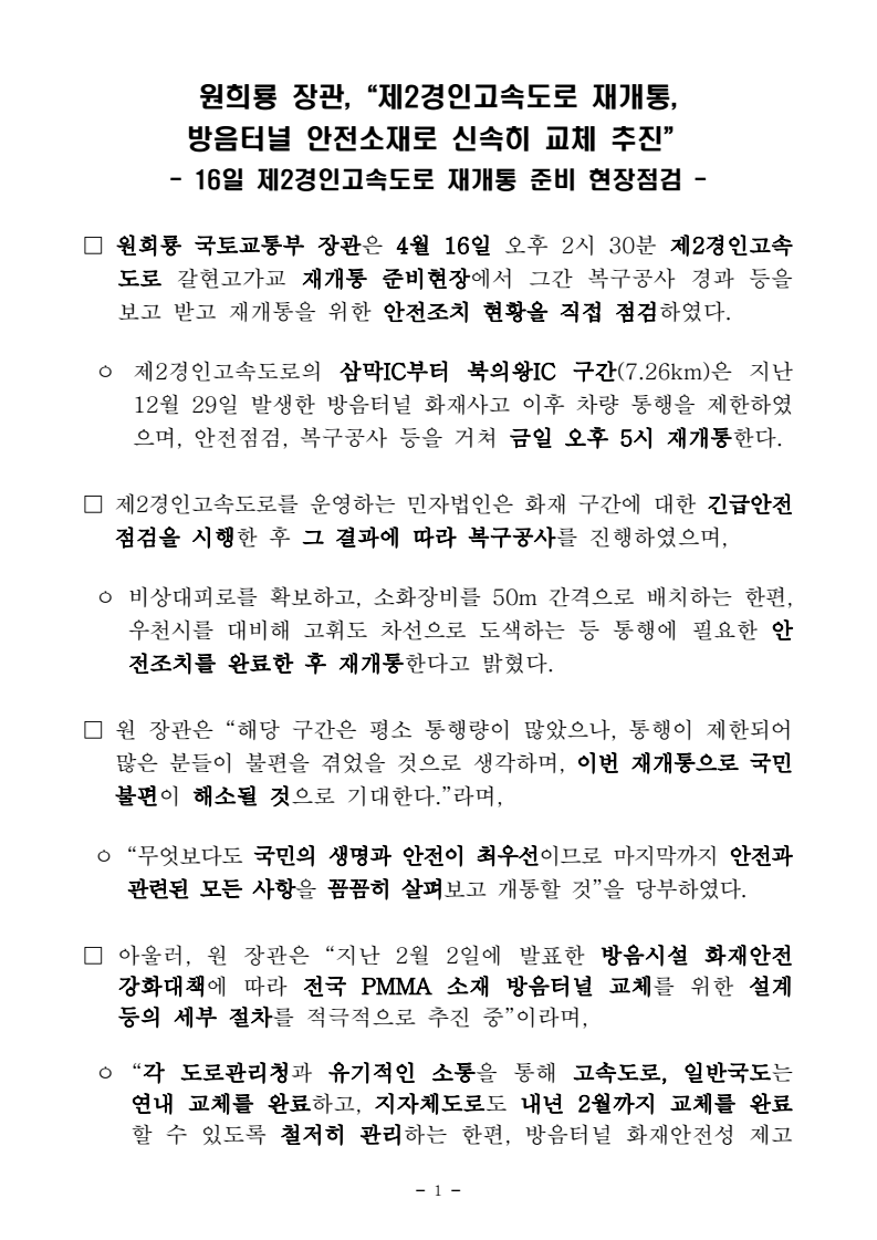 – 1 – 원희룡 장관, “제2경인고속도로 재개통, 방음터널 안전자재로 조속히 교체” – 16일, 제2경인고속도로 재개통 대비 현장점검 – □ 원희룡 국토교통부 장관은 4월 16일 오후 2시 30분 제2경인고속도로 갈현고가도로 재개통준비현장에서 복구공사 진행 상황을 보고하고 재개통을 위한 안전조치 현황을 보고했다. 직접 검사함. ㅇ 제2경인고속도로 삼막IC~부우의왕IC 구간(7.26km)은 지난 12월 29일 발생한 방음터널 화재사고 이후 차량통행이 통제되었으며, 안전점검 및 점검을 거쳐 오늘 오후 5시부터 재개통된다. 복원 작업. □ 제2경인고속도로 민간사업자는 화재구간 긴급안전점검을 실시하고 그 결과에 따라 복구작업을 진행하였다. 우천에 대비해 고휘도 차선 도색 등 교통에 필요한 안전 조치를 마친 후 재개한다고 밝혔다. □ 원 장관은 “평소 해당 구간은 통행량이 많았는데 통행제한으로 많은 분들이 불편을 겪으신 것 같은데 이번 재개통으로 국민 불편이 해소될 것으로 기대한다”고 말했다. 생명과 안전이 최우선인 만큼 안전과 관련된 모든 사항을 오픈 전 마지막까지 철저히 검토해주시길 부탁드린다”고 당부했다. □ 또한 원 장관은 “지난 2월 2일 발표된 방음시설 소방안전 강화대책에 따라 전국적으로 PMMA로 제작된 방음터널 교체 설계 등 세부 절차를 적극 추진하고 있다”고 말했다. 유기적인 소통을 통해 고속도로와 일반 국도는 연말까지, 지자체 도로는 내년 2월까지 교체할 수 있도록 철저히 관리하는 한편, 방음터널 화재안전 향상을 위한 제도적 개선-2 – 차질 없이 진행되고 있습니다. 하겠다”고 말했다. 2023. 4. 16. 국토교통부 대변인