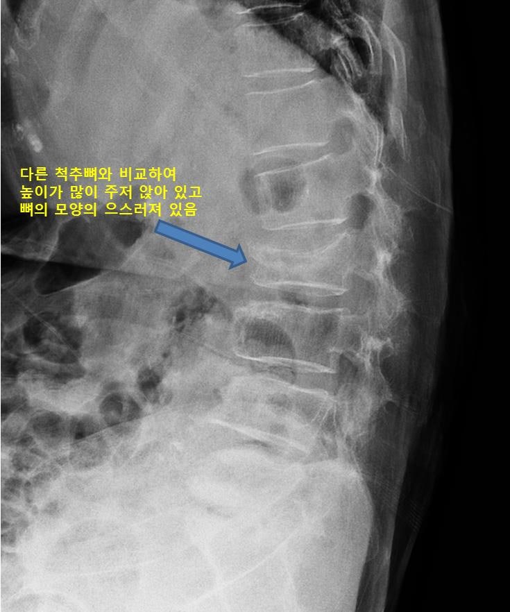 #치료 치료의 가장 중요한 것은 뼈 유합을 얻는 것이 가장 중요하므로 가장 빠른 방법은 쓰지 말 것이다. 플라스틱의 튼튼한 보조기를 24시간 착용하게 되지만 환자들의 첫 2주는 너무 아파한다는.(물론 누워서 있을 때도 예외 없이!)이것이 처음에는 아파서 빨리 낳기 위해서 열심히 하지만 한달 정도로 어느 정도 익숙해져서, 계절적으로 땀을 흘리는 시기가 오면 답답해서 한달로 해소하는 경우가 많다고! 하지만 빠른 뒤탈 없이 뼈 유합이 잘 되려면 3개월간 착실히 보조기를 착용해야 한다. 보조기를 착용해도 골절이 진행하거나 통증이 조절되지 않을 때는 “풍선 척추 성형술”을 진행한다. 이는 국소 마취하고 뼈를 붙이는 시멘트를 넣는 간단한 시술이다. 위 형성술만 있으면 안 되는 경우는 전문의의 진단 아래 전신 마취에 의한 척추 고정술을 한다. 서울원 병원 척추 센터, 정부·수정 원장