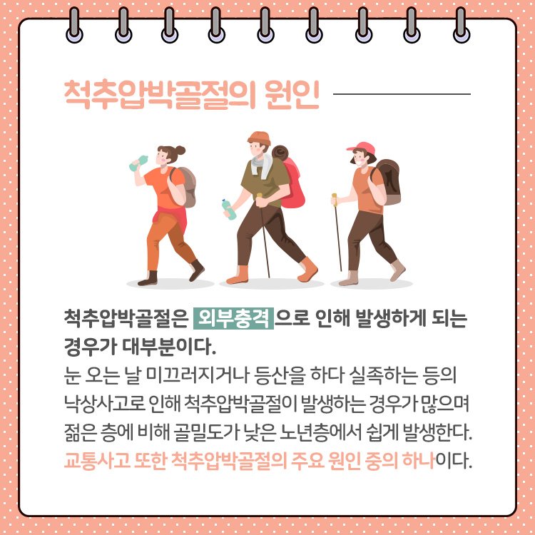 #정의 척추압박골절은 척추뼈가 외부 충격이나 환자 자체의 내부 문제로 인해 무너지는 것을 말한다. 척추는 원래 우리 몸을 지탱해 주는 아주 중요하고 튼튼한 뼈이지만 때로는 생각보다 쉽게 골절되는 부위이기도 하다 #척추압박골절의 원인은 크게 두 가지가 있는데 첫째, 뼈가 부러질 정도의 외상이 있는 경우 예를 들어 교통사고, 전도, 스포츠 부상 등 심각한 외상 때 골절될 수 있다. 두 번째는 뼈가 약할 때 골절된다. 이는 골다공증과 관련이 있는데 골다공증으로 인해 뼈 자체가 약한 경우 주저하지 않거나 가벼운 넘어짐, 엉덩방아로 인한 골절이 일어났을 때 등 일상적인 생활 속에서 발생할 수 있다. 척추압박골절 증상 그리고 합병증 vertebra compression fracture